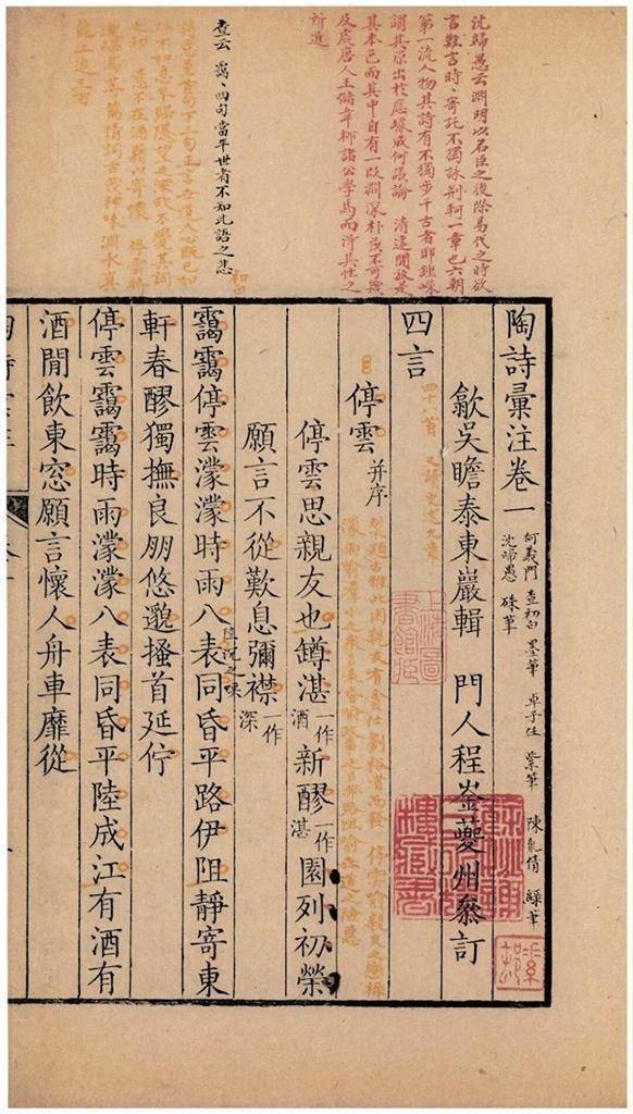 吴瞻泰的汇刻本,包括汤汉、李公焕、何孟春、黄文焕、方熊五家的陶集注,李善、刘履、张凤翼三家的《文选》注,以及同期代顾炎武、汪洪度、王棠、程元愈、程崟等东说念主的注目,可谓全面。此外,吴瞻泰还在东说念主名、地名、典故等方面,增补了不少注目。